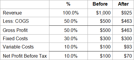In this analyst's experience, numbers speak louder than words. Below is a hypothetical model of an imaginary corporation's profit numbers assuming a Gross Profit Percentage of 50%, fixed costs of 30% of the starting revenue number, variable costs of 10%; and assuming that the revenue line shrinks by 7.5% because of the increased unemployment levels in the country.