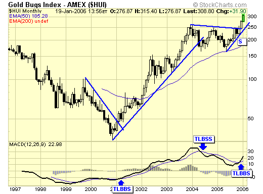 The current bull market in gold is perfectly set up to whipsaw those who try to outsmart the market. Everyone knows the market is overbought, and as soon as it drops 3 to 4% one day, traders rush to exit, only to see the market bounces back the next day recapturing all of the loss and more. These folks are now out of the market and when prices continue to move up, these sidelined capital eventually give up and buy back, thus providing more fuel for the rally. So, without a crystal ball, how do we know when the real top is in? Without sounding pompous, I believe that is a wrong question. That is something we don't need to know ahead of its time.