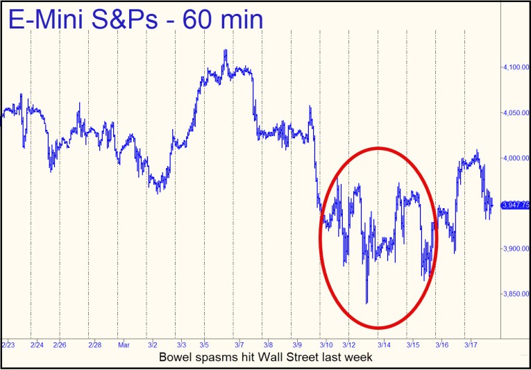 To pivot, or not to pivot? That is the question Fed Chairman Powell will have pondered over the weekend while tending chicken breasts, franks and burgers spaced meticulously on the grating of a 148,000 BTU grill. If conscience doth indeed make cowards of us all, we might expect him to act boldly. But how? Does he risk gutting the American Dream for a generation or longer by staying the course? Recall that his last utterance, on March 7, implied not merely that credit tightening would continue, but that it would accelerate. The stock market reacted like a concertgoer sitting in the middle of a row who has just felt the first gurgle of food poisoning in his bowels. Sellers panicked with spasms that quickened as the week wore on, and it was fully five days before fears appeared to recede. Investors opened their air locks last Monday and cautiously drew a lungful of what they hoped would be oxygen. It was, with just enough helium to make the broad averages frolicsome at times, if not quite giddy.