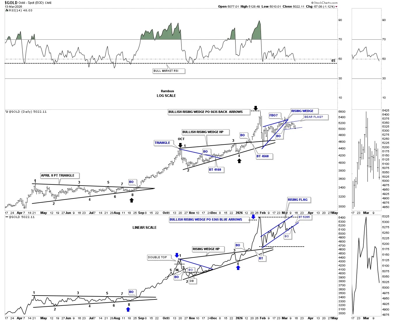 Next is the daily combo chart with the top gold chart being a log scale bar chart and the lower chart being a linear scale line chart for two different perspectives. After reaching its measured move price objective, black arrows, gold began to decline, finding initial support on the backtest to the top rail of the black bullish rising wedge. From that point, the price action formed the blue bearish rising wedge with the small blue bear flag just below the bottom trend line. That little blue bear flag won’t be complete until the bottom trend line is broken.