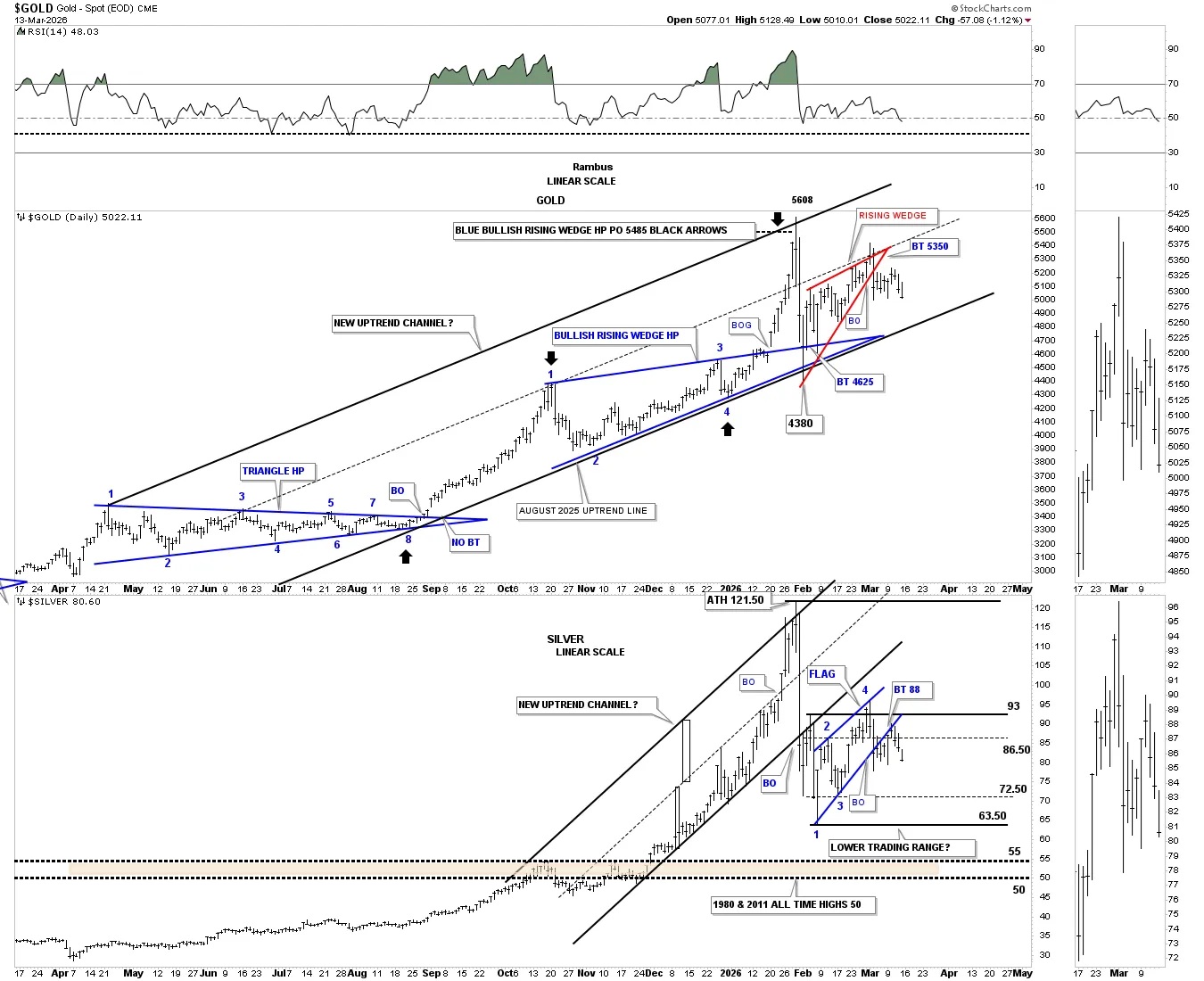 This next combo chart has gold on top with silver below. What gold still has going for it is that it’s still trading inside its parallel uptrend channel, but has formed the red bearish rising wedge.