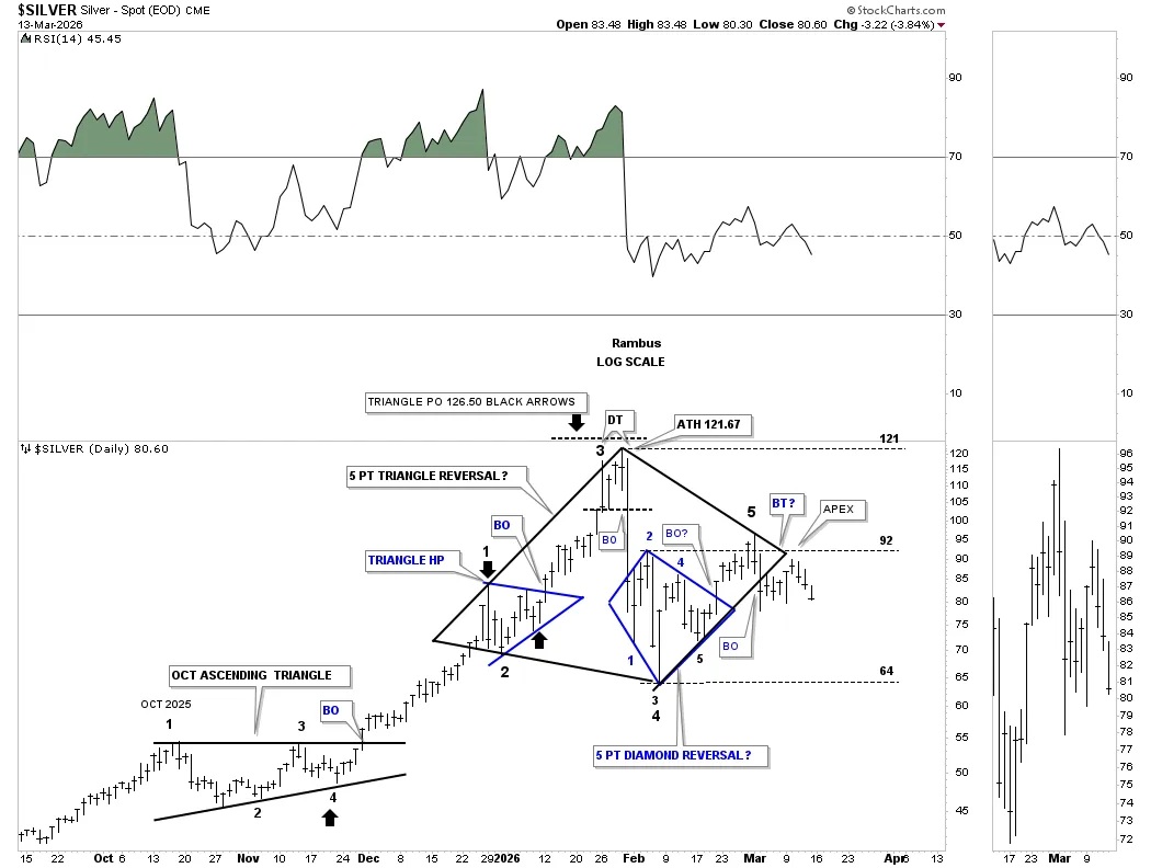 This next chart for silver has a more bearish look to it. The blue diamond on the chart above has 5 reversal points, which is needed to form a reversal pattern. Silver has built a much larger diamond below, which also has 5 completed reversal points. Again, the minimum price objective for the 5-point black diamond would be down to the 64 area, the low at reversal point #2, but that would be a minimum price objective. Since the diamond is a reversal pattern, the price action could fall much lower than the 64 area.
