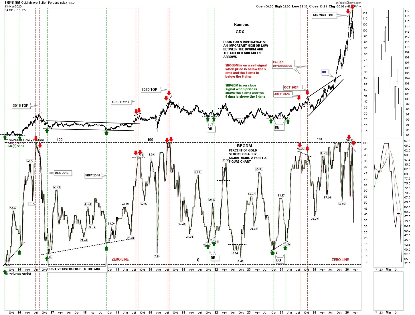 When the PM complex first began to top out in January of this year, we looked at several indicator charts to help guide us. This first chart is a combo chart, which has the GDX on top with the BPGDM on the bottom. The BPGDM shows how many gold stocks are on a point and figure buy signal, with the range between zero and 100, with 100 meaning all the gold mining stocks are on a point and figure buy signal and extremely overbought, and just the opposite at the bottom.