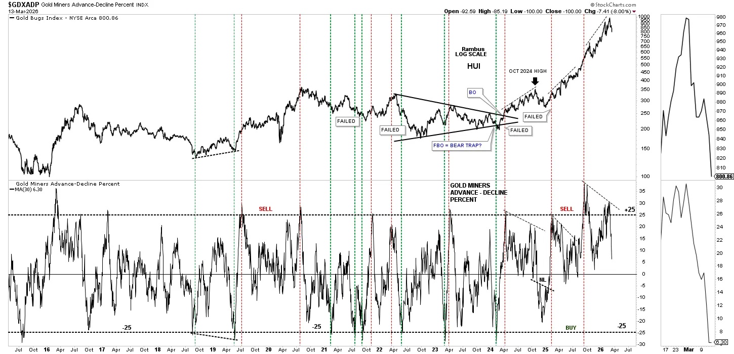 The last time we looked at this indicator chart, which has the HUI on top with the GDXADP, advance decline percent on the bottom, there was a larger divergence between the two. Even though the HUI went on to form the marginally new higher high, the GDXADP didn’t participate and made a lower low, which is not a healthy development.