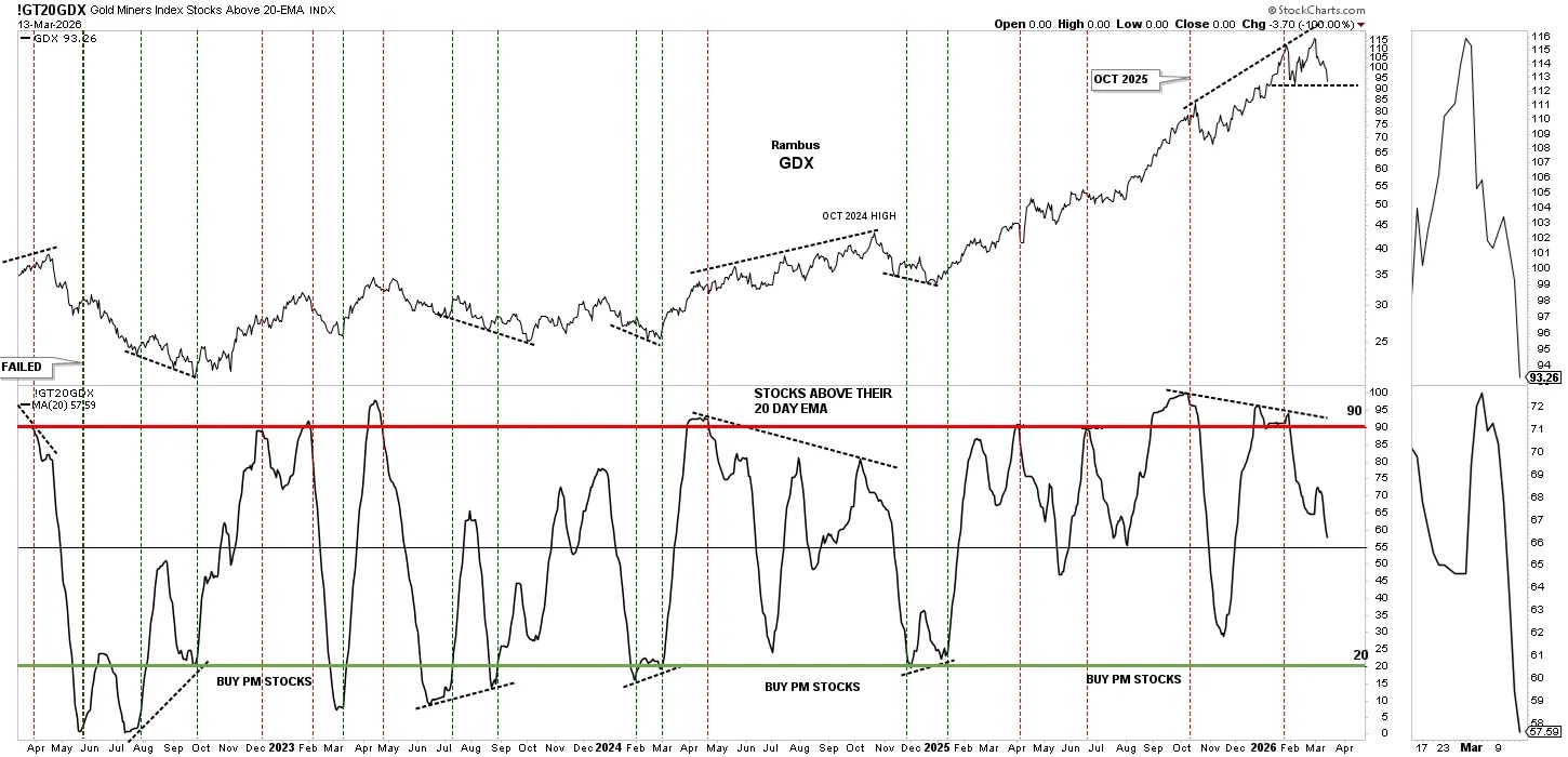 This next indicator chart has the GDX on top with the GT2OGDX on the bottom, which measures PM stocks above their 20-day EMA. Here again, you can see another massive divergence between the two. Keep an eye on the GDX chart on top – I added the possible double top trend line at the most recent all time high.