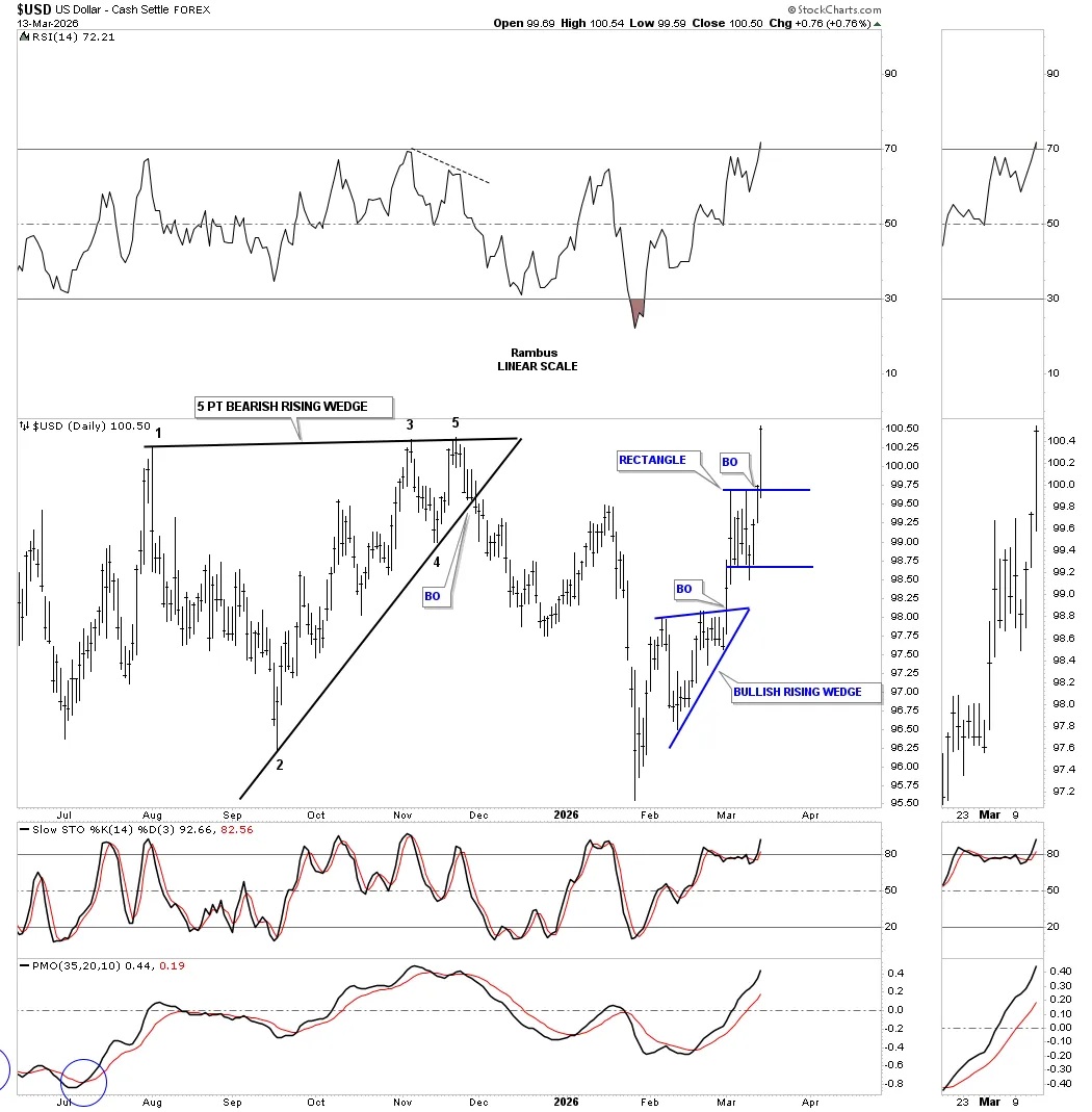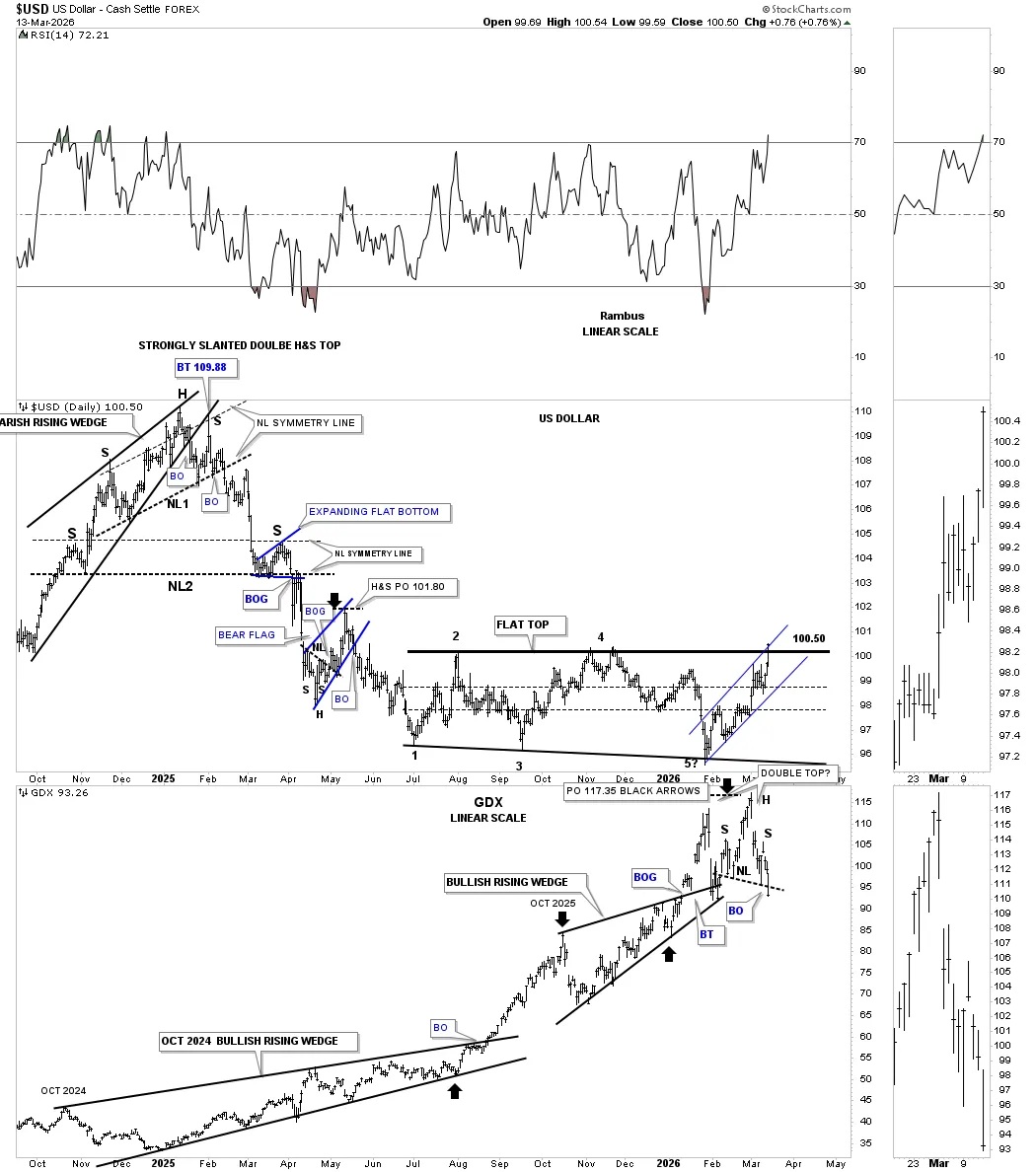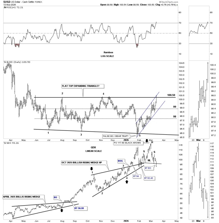 Going back further in time is the daily combo chart, which has the US dollar on top with the GDX below. Remember, it takes an odd number of reversal points to create a reversal pattern. In late January of this year, the US dollar put in its 5th reversal point, which wasn’t completed until last Friday when the price action reached the top of the July 2025 flat top expanding triangle at 100.50. It’s now time for the dollar bears to take charge and stop the US dollar from moving any higher, or a confirmed breakout is going to take place.