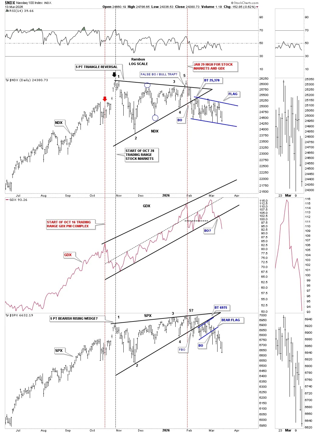 I’ve tried to dispel the ongoing notion that the PM complex needs the US stock markets to crash and burn for a sustained bull market rally, which is far from true. Below is a triple combo chart with the NDX on top, GDX in the middle, and SPX on the bottom.