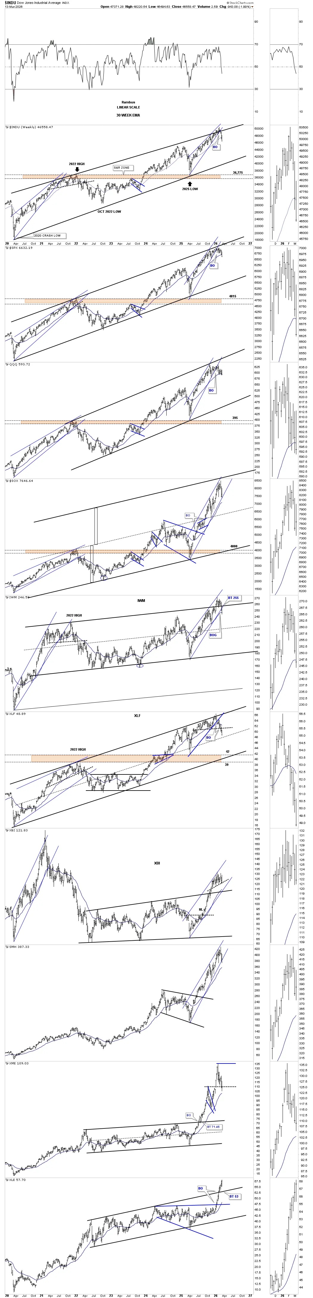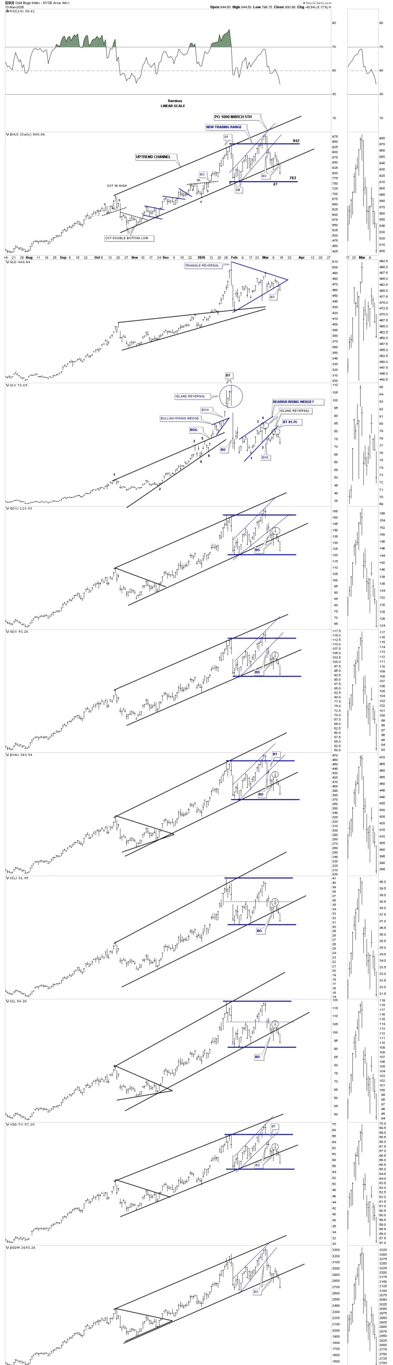 Let’s finish this Weekend Report by looking at a couple of combo charts for the US stock markets, starting with this daily chart. Last year in April, the US stock markets bottomed and began to rally hard to the upside. During the nearly one-year rally, many have formed a bearish rising wedge or channel. The topping process has been long and drawn out, but the indexes are starting to roll over. The XLF banking index is showing the most weakness, which is telling in that it’s leading the way lower. The SOX has held up the best but it’s beginning to show some weakness. Watch how it interacts with the lower rail of the uptrend channel and the horizontal black dashed line that’s been acting as support. The IWM small caps has broken down and made a new lower low.