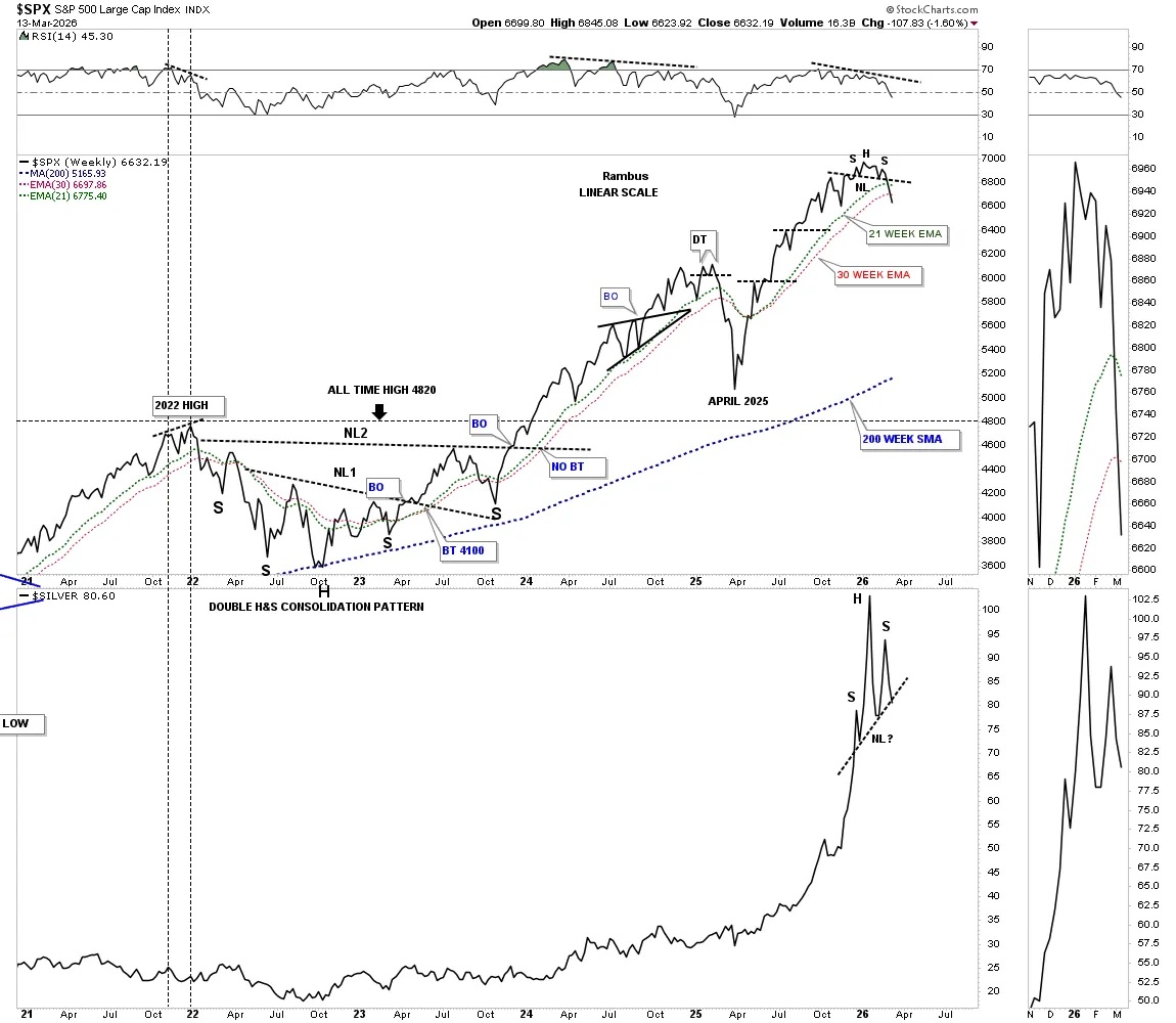 Many times a weekly line chart can show you a pattern that’s hard to see on a weekly bar chart. Below is a weekly line chart with the SPX on top and Silver on the bottom. The last time we looked at this combo chart, the neckline was still holding on the SPX, but last week’s decline now shows the H&S top a little more clearly.