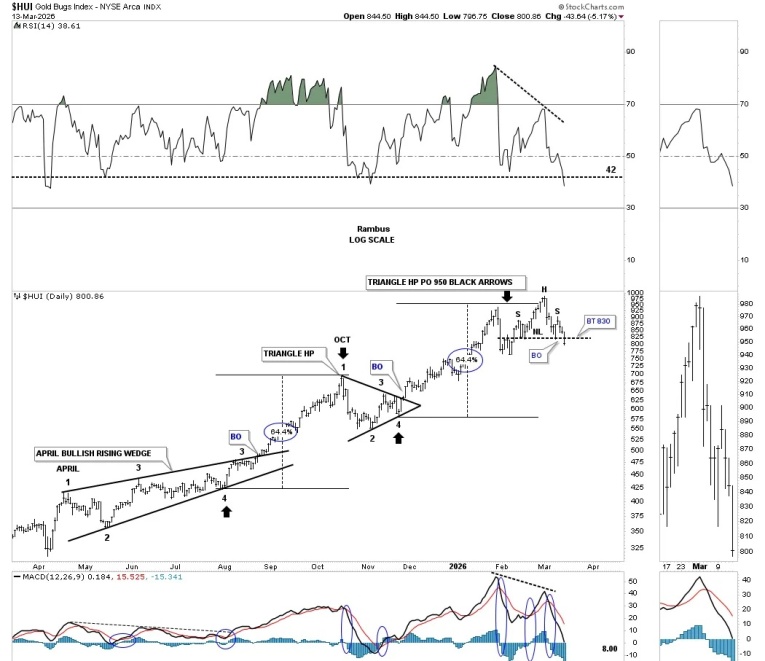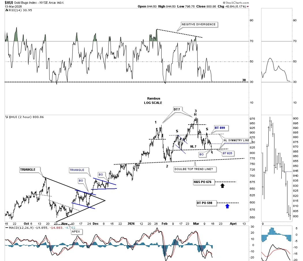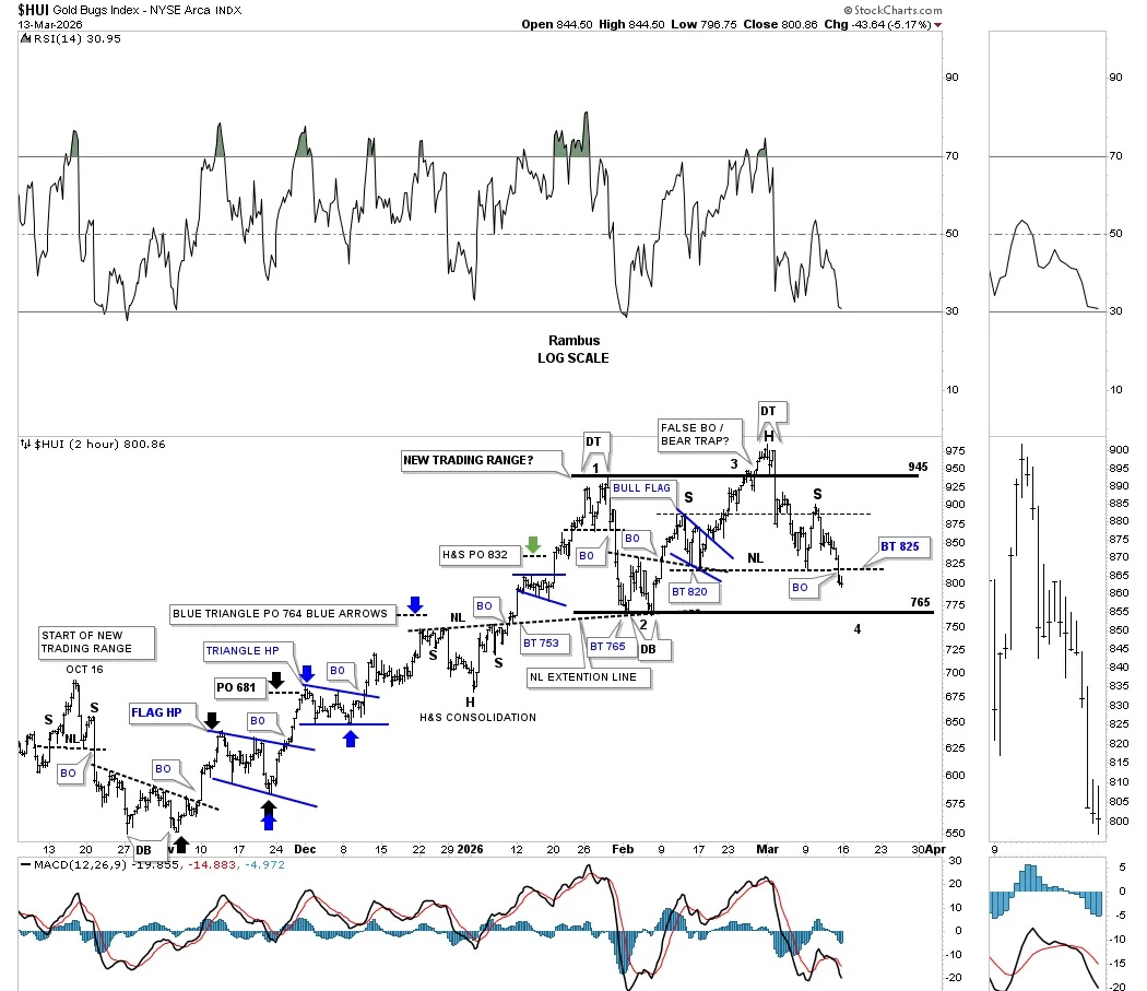 At the end of January and early February of this year, the HUI formed a small double top reversal pattern at reversal point #1, which strongly suggested the October 2025 rally had come to an end, and it was likely that it was time to start consolidating those gains. If you recall, there were two very large down days back to back off the double top high, which setup the double bottom low at reversal point #2 in what I started calling the setup at that time “new trading range.” Now we had a double top reversal pattern at reversal point #1, and a double bottom reversal pattern at the 2nd reversal point low. Keep in mind there has to be a minimum of four reversal points in a consolidation.
