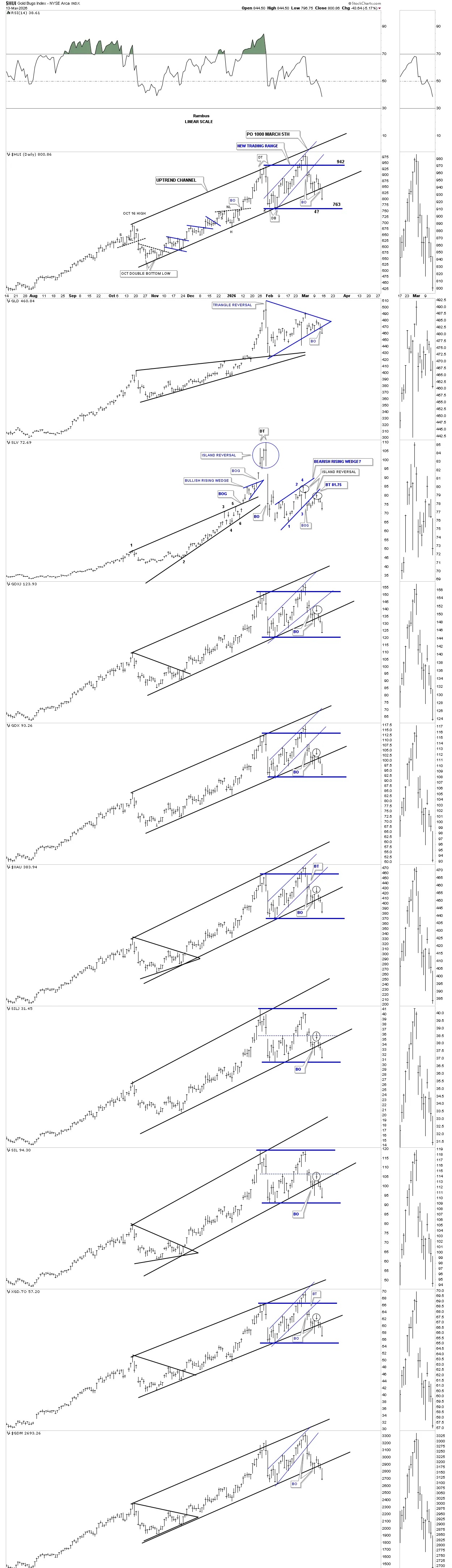Silver on the lower chart broke its uptrend channel on that massive one-day decline off the all-time high and was only able to backtest it from below. Since the backtest, silver has traded sideways in the lower half of its potential massive trading range. After completing the backtest to the underside of the blue bearish rising wedge last week, the bottom of the lower trading range should come into play around 64 or so.