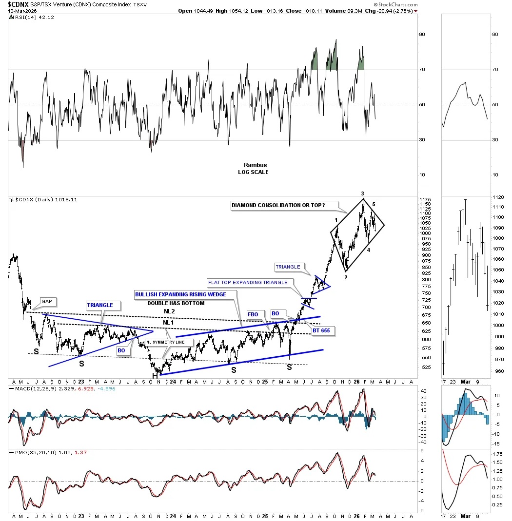 This longer term weekly chart for the CDNX shows how the possible 5 point diamond reversal pattern fits into the very big picture. In order for the diamond to be a bullish diamond consolidation pattern the bottom trend line will have to hold where the 6th reversal point would need to form.