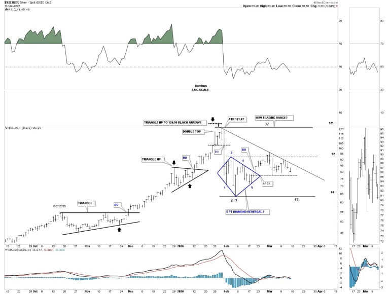 Moving on to silver, below is a short-term daily chart, which shows the measured move price objective up to 126, which was a bit higher than the 121 all-time high, but close enough to call it complete. Since forming the small double top at the all-time high, silver declined strongly to setup the bottom of the new trading range around the 64 area.