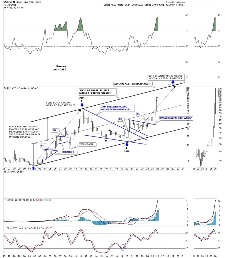 This next chart for silver is a bit concerning. For many years, we’ve been following the 2002 secular parallel bull market uptrend channel. The long black arrows measure time and price off the bottom of the uptrend channel. One thing that took me by surprise was the velocity of the rally out of the 2020 pandemic crash low. I was initially looking for the price action to reach the top trend line somewhere around the 142 area in early 2030 or so, not 121 in January of 2026, but I’m not going to argue with the chart. It could still happen, but there would be a lot of sideways chopping action before silver got there, with only a 25-point gain from the 2026 all-time high.