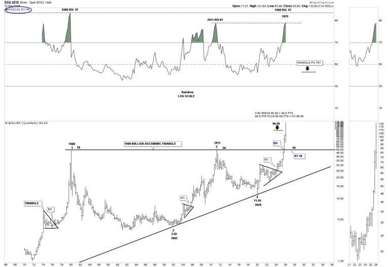 What I think is more likely, looking at the history chart for silver, is that the price action will backtest the top rail of the massive 1980 ascending triangle around 50 or so. From that point, we can see how the price action interacts with the 50 area but that should represent a good low risk entry area.