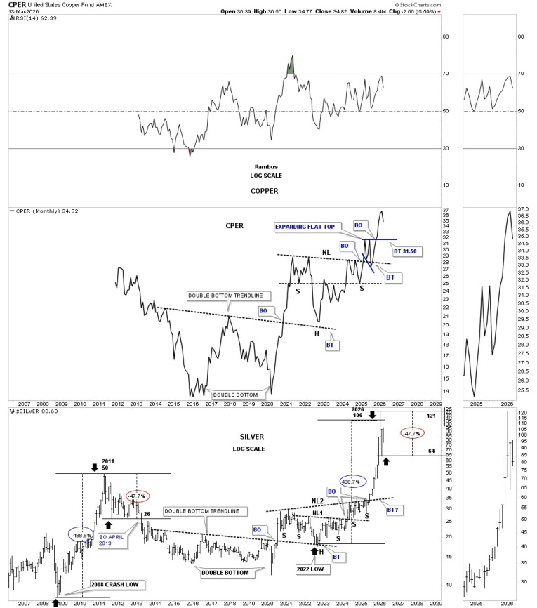 This last chart for tonight is a long-term monthly combo chart with the CPER, copper fund on top and silver below. This chart shows how copper and silver tend to move together, but it’s not a tick-for-tick type correlation. It’s the important reversal points that I look for, which show the positive correlation.