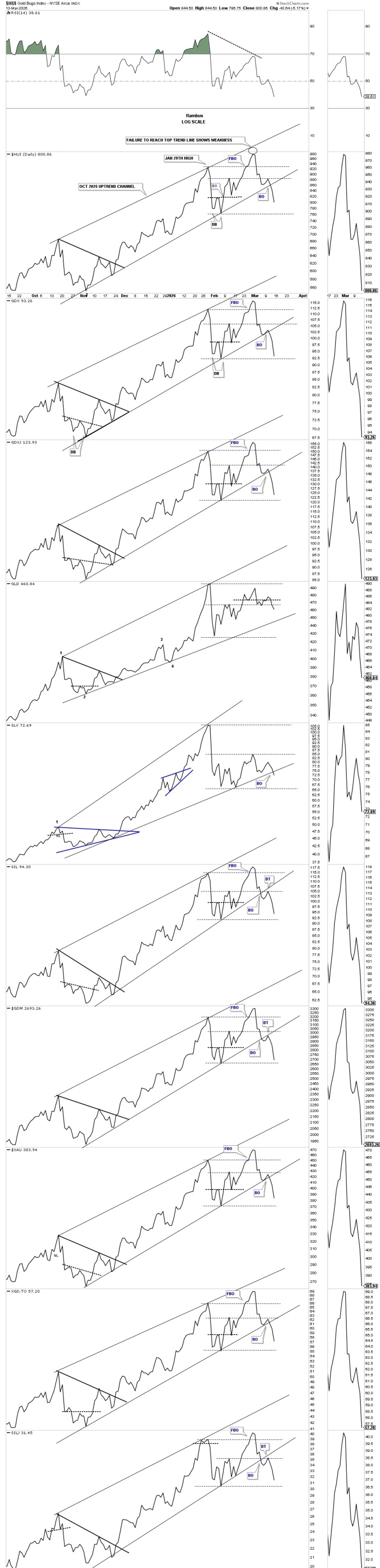 I would like to start using a 2-hour chart for the HUI, which we’ve been following since the October 2025 double bottom low, which launched the most recent impulse leg of the bull market. I apologize for this 2-hour chart being so busy, but these are the small consolidation patterns that formed during this last leg of the bull market. The colored arrows show the measured move price objectives for each small consolidation pattern.