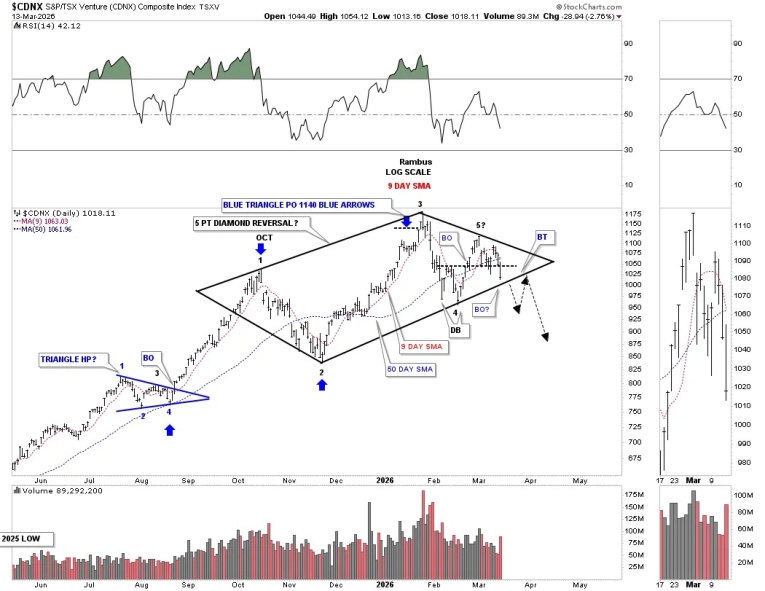 Let’s do a quick update on the CDNX which is attempting to form a 5 point diamond reversal pattern. On Friday of last week the price action closed below the double bottom trend line after forming the possible 5th reversal point. A breakout below the bottom trend line will complete the diamond reversal pattern.