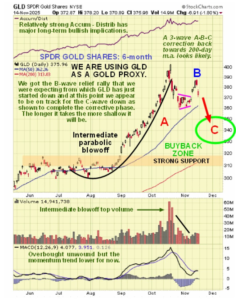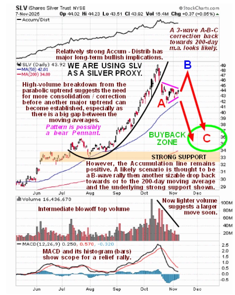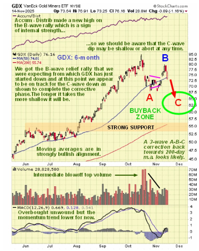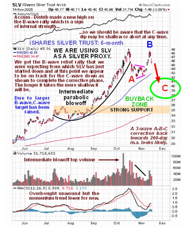 The Precious Metals sector has followed the script set out for it in the article posted on the site at the end of last month entitled PM SECTOR CORRECTION ROADMAP with SLV dropping back to $42.5 early this month as predicted before the expected B-wave countertrend rally started. However, the B-wave rally was somewhat larger than expected and the Accumulation lines of GLD, GDX and SLV have all shown strength relative to price, making new highs in the case of GDX and SLV, which is viewed as a bullish divergence which suggests that the C-wave of the corrective phase, which started on Thursday, will probably be shallower than we earlier expected and could abort at any time, which we need to bear in mind. This is why we are “putting our best foot forward” and buying some stronger stocks even during the corrective phase. Here is the chart from the November 9th PM SECTOR OUTLOOK and we now know that it decided to do the B-wave…