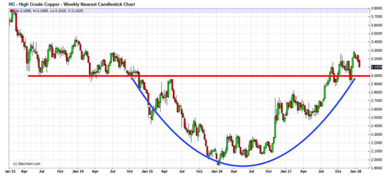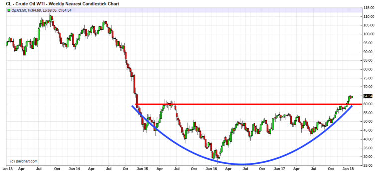 After peaking with a false breakout near 104 in early 2017, the US dollar (as measured by the Dollar Index) has continued to plummet in 2018. As I type, the index is near 90 and already down over 2% year-to-date. Dollar weakness has traditionally been positive for commodity prices, and the evidence of this can be seen below.