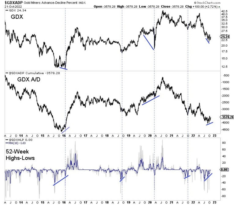 Below you will see the positive divergence in the GDX advance-decline line, the third one in the last seven years, and the positive divergence in fewer new 52-week lows as GDX made its most recent low.