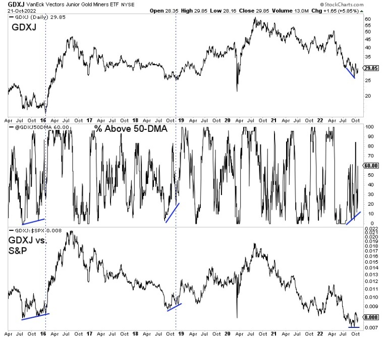 The percentage of GDXJ stocks trading above the 50-day moving average trended higher as GDXJ made a lower low and the GDXJ to S&P 500 ratio hit bottom before GDXJ.