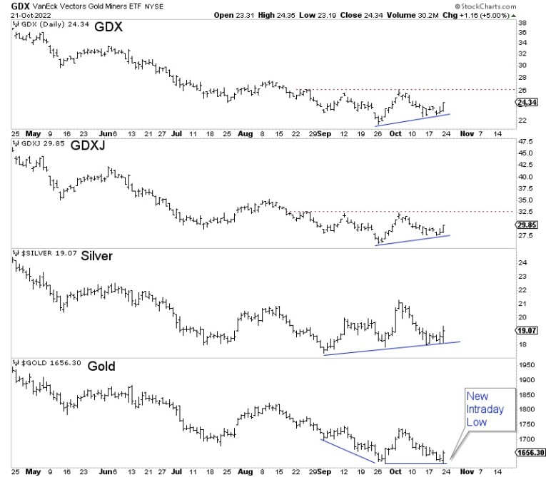 Second, before Gold reversed on Friday, it traded $1 lower than its low at the end of September. Silver, GDX, and GDXJ were not even close to making a lower low on Friday.