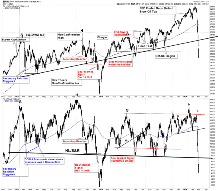 December 14th, 2018, according to Dow Theory Methodology, was the date that a bear market sell signal was triggered, announcing that we were now in a bear market. This valid signal only occurs in Phase III of a bull market. Since then, despite the wild blow off top to new Dow highs the sell signal was never reversed and remained valid. To reverse the signal would require the transports going to new highs along with the Dow. Since this never occurred the signal remained in affect.