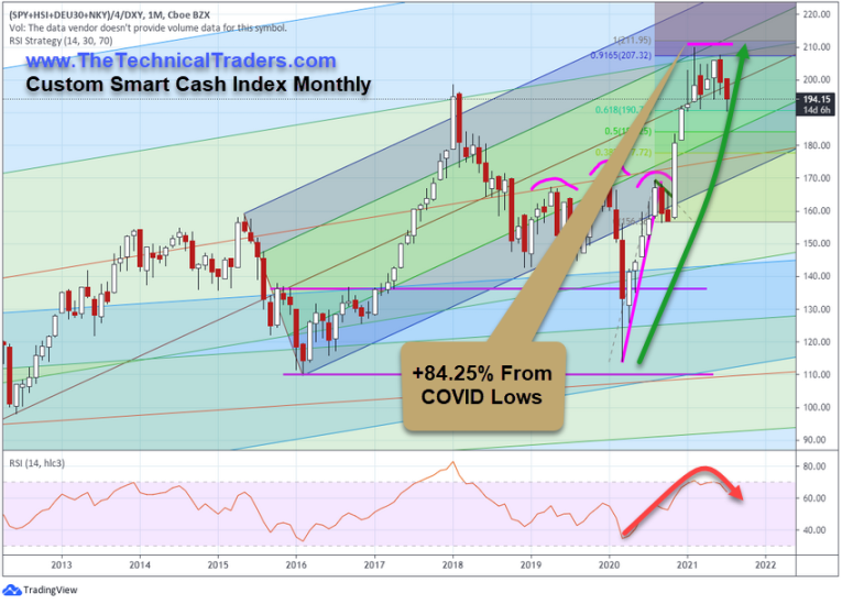 This first chart shows our Custom Global Smart Cash Index Monthly Chart. The point we want you to focus on with this chart is the sideways and weaker price action over the past 6+ months as well as the +84.25% rally from the COVID lows.