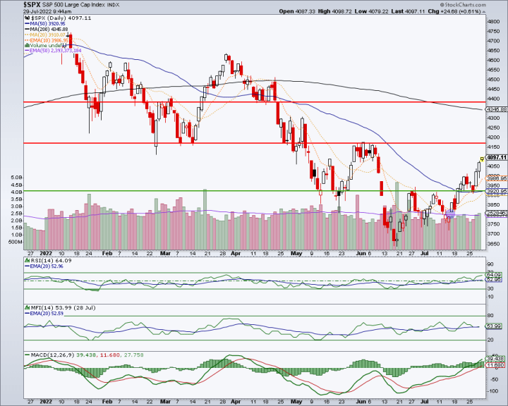 - RSI, MFI (Money Flow Index, which thanks to a ping from subscriber Mike C I’ve added to charts that include volume) and MACD are positive and not overbought.