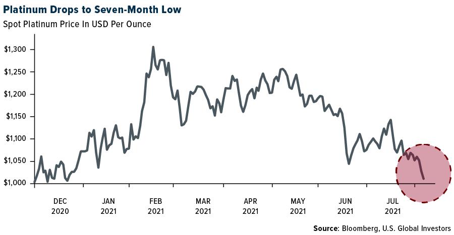 • Platinum dropped to a seven-month low as the spread of the coronavirus dents the outlook for industrial commodities, while a Federal Reserve official indicated the central bank is on course to taper stimulus. The metal used in catalytic converters fell for a third day as the spread of the delta strain punctures the narrative of a rapid global recovery. Platinum has tumbled 19% from this year’s peak in February as a computer-chip shortage curbed auto production.