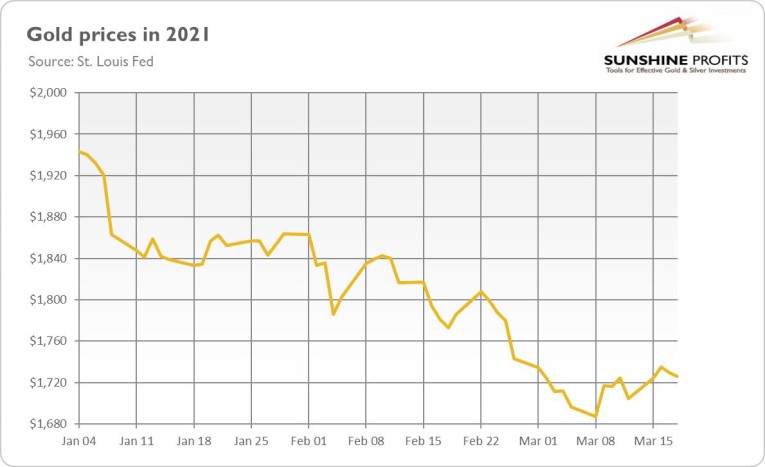In the last edition of the Fundamental Gold Report, I analyzed the latest FOMC statement on monetary policy and economic projections. Today, I would like to focus more on Powell’s press conference. My reading is that the Fed Chair sounded like a dove. First of all, he emphasized several times that the jump in inflation this year will be only transient, resulting from the base effects and rebound in spending as the economy continues to reopen. And Powell explicitly stated that the US central bank will not react to this rise in consumer prices (emphasis added):