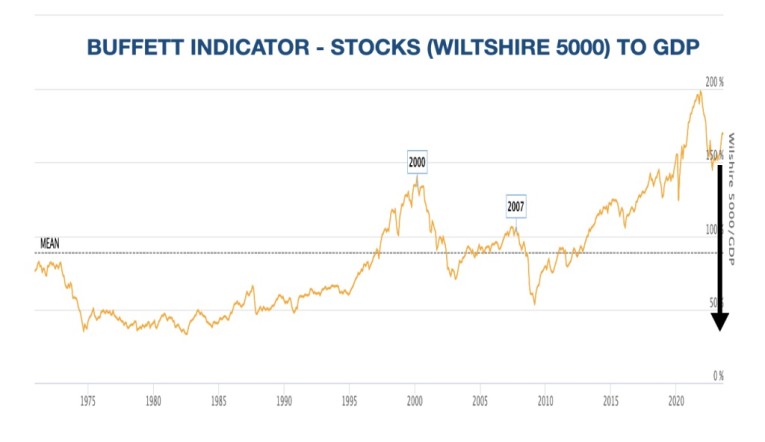 Buffett’s favourite indicator, Stocks to GDP is massively overvalued. To decline to the mean would involve a 50% fall. But overbought markets always overshoot. So a 70-90% decline would not be unrealistic. In such scenario, it won’t only be stock prices that decline but GDP could easily fall 10-20% in real terms.