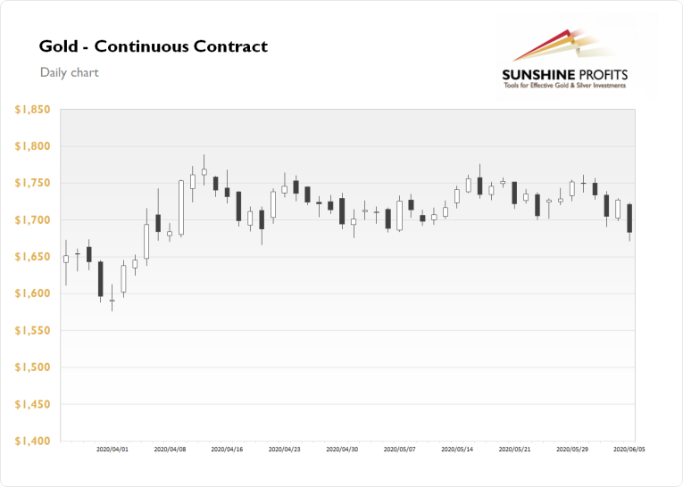 The gold futures contract lost 2.57% on Friday following much better than expected U.S. monthly jobs data release. Global markets went risk-on and gold has sold off as a safe-haven asset. On Monday a week ago the price has reached slightly above $1,760 and Friday’s daily low fell at $1,671.70. Gold is trading at the bottom of its medium-term consolidation, as we can see on the daily chart: