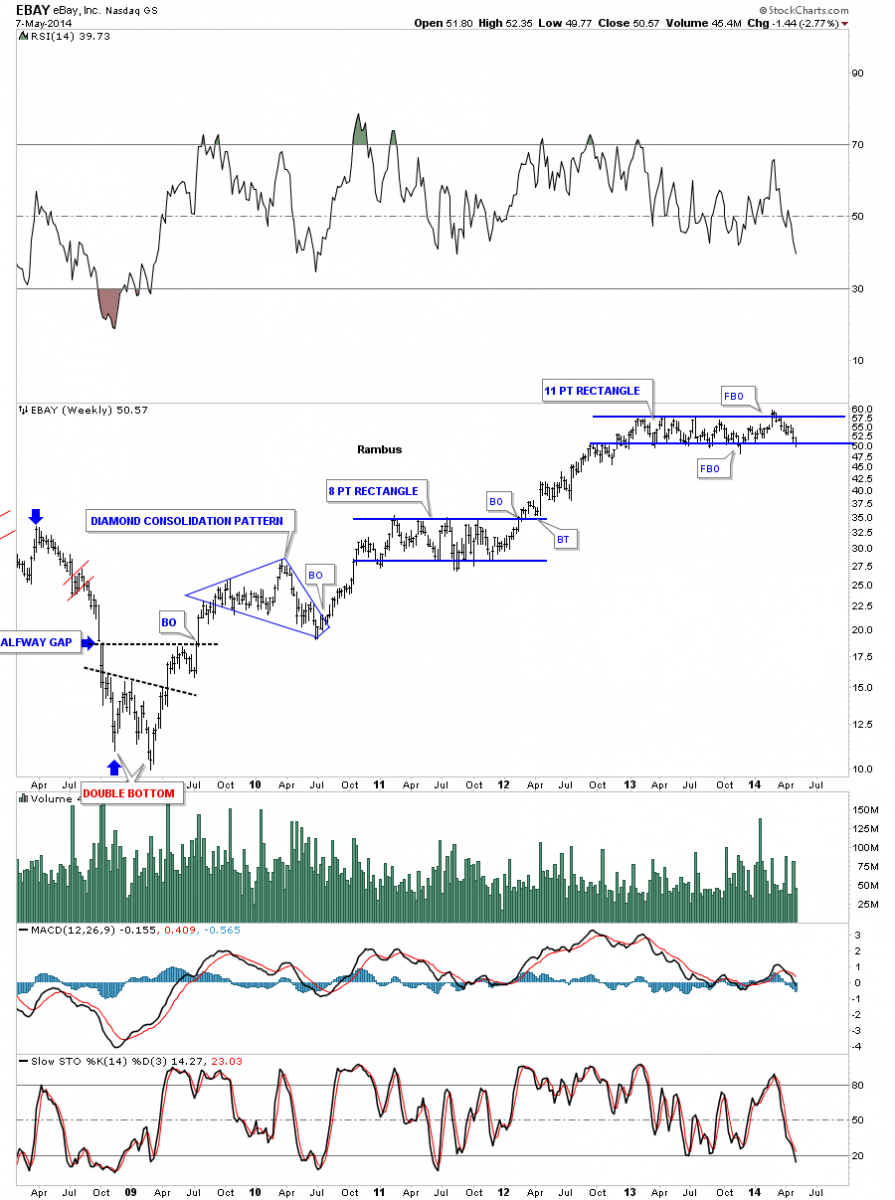 The last time I posted this chart for PCLN was when it was breaking out from the H&S consolidation pattern back at the beginning of 2013. You never know what kind of price rise you’ll get only that it should be a good one when a stock breaks out of a fairly large consolidation pattern. This chart also shows you a perfect example of how support and resistance works. Notice the eight point blue rectangle that formed back in 2011. Once the price action broke above the top blue rail it then reversed its role from, what had been resistance to then support as shown by the double headed H&S consolidation pattern. That is perfect Chartology 101.