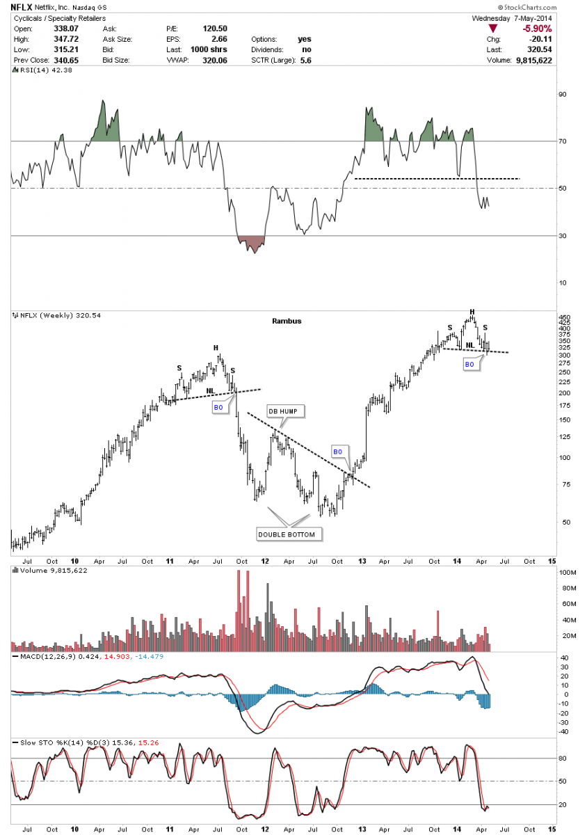 NFLX has been a high flyer but it to looks like it’s building out a H&S topping pattern. Note the beautiful H&S top that was made in 2011 and the decline that followed.
