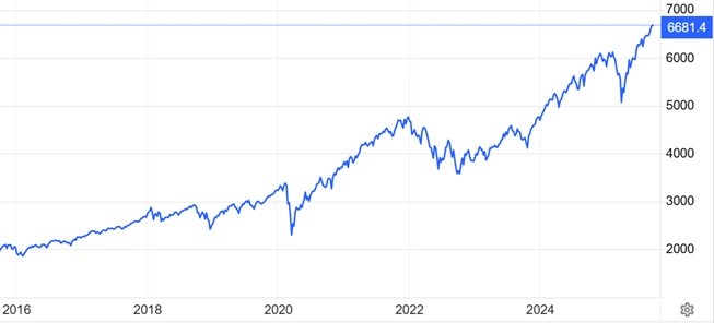 The S&P 500 by contrast continues to hit all-time highs, having almost tripled since the pre-financial crisis peak in 2007.