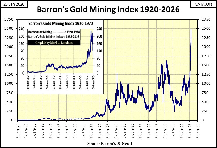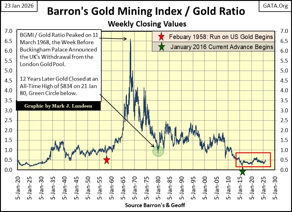So, the large movements seen below from 1920 to 1968, were due to the swings in the valuation of the BGMI alone.  After 1970, both the price of gold, as well as the valuation of the BGMI moved over time.  For gold, from the dollar’s old gold peg at $35 an ounce in 1970, to gold at $4,989 an ounce at this week’s close.