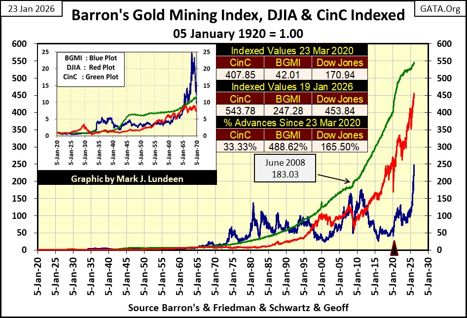 When that happens, and it will, I expect that once again, the BGMI will trade above the rate of inflation (Green CinC Plot), in the chart above.  Something the Dow Jones hasn’t done since the 1920s.