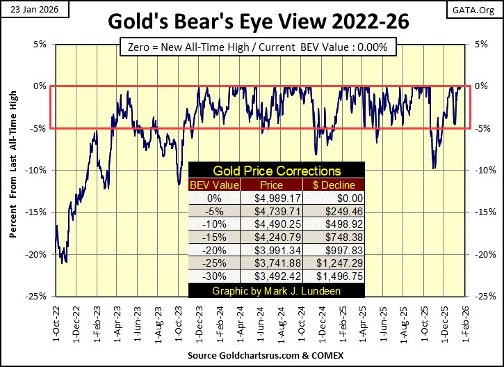 Like the Dow Jones’ BEV chart, for the past two years gold’s BEV chart below, has become very repetitive.  However, when the repeating pattern seen below, inside scoring position’s red rectangle, includes 97 new all-time highs for gold since November 2023, that took the price of gold up from $1935, to this week’s close of $4989, a gain of $3054, I can learn to live with that.