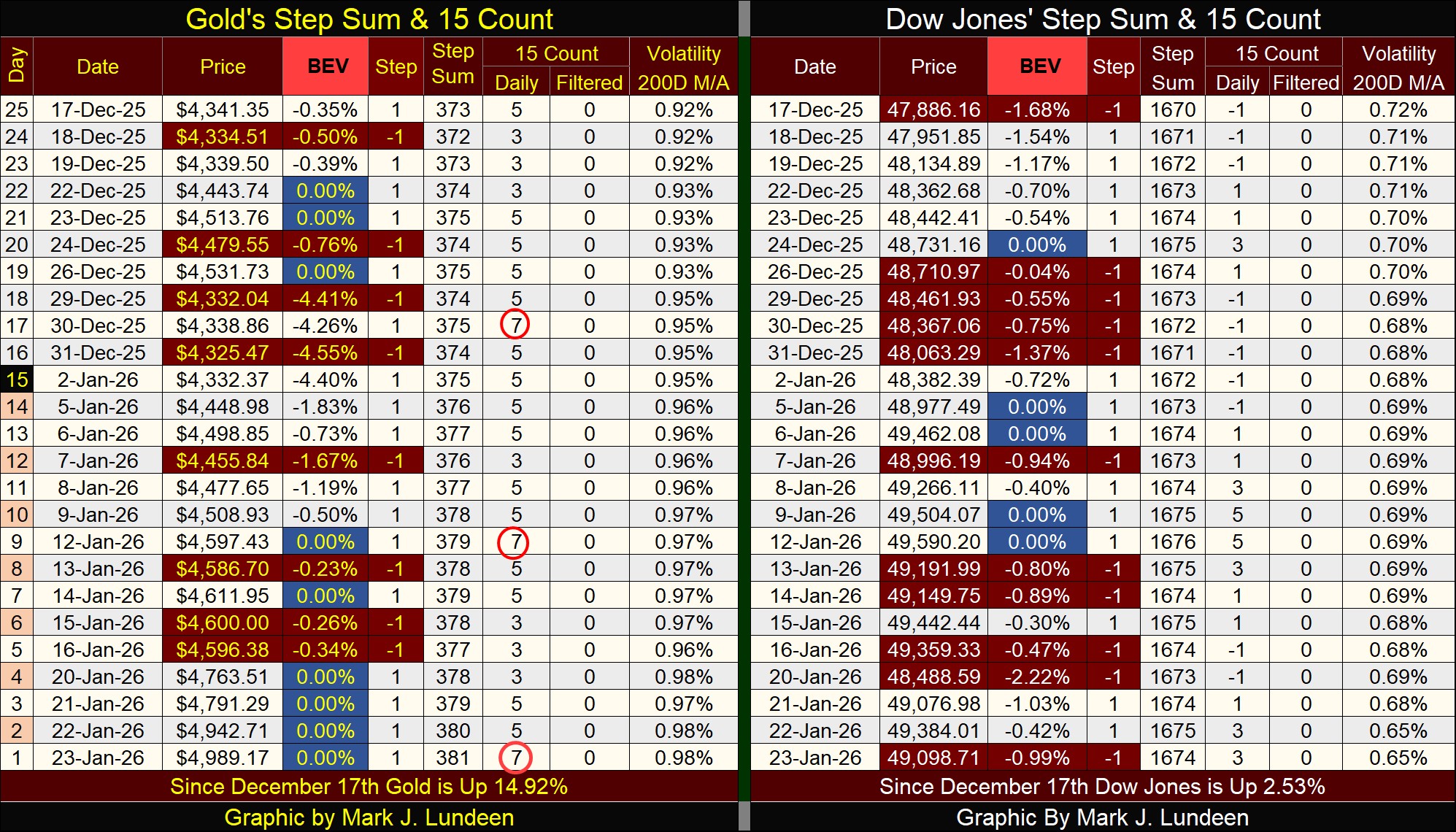 On the Dow Jones side of the step sum table above, all looks well.  Since December 17th, the Dow Jones has seen five new BEV Zeros, and closed the week less than 1% away from making its sixth new all-time high.  Daily volatility is coming down, and that is a big issue for the continuing health of this Dow Jones bull-market advance.  And since December 17th, the Dow Jones has advanced by 2.53%.