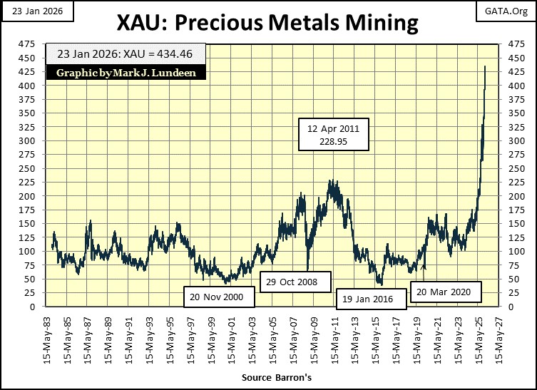 In my table below, listing the BEV values for the major stock indexes I follow, the XAU is #1, at the top of the list, and for good reason, as seen in its chart below.  From its lows of January 2016 (38.84), ten years ago, the XAU has advanced by a factor of 11.19.  Second place in this ten-year race is the NASDAQ 100, which has since January 2016, advanced by a factor of 6.17, far below the gains of the XAU.