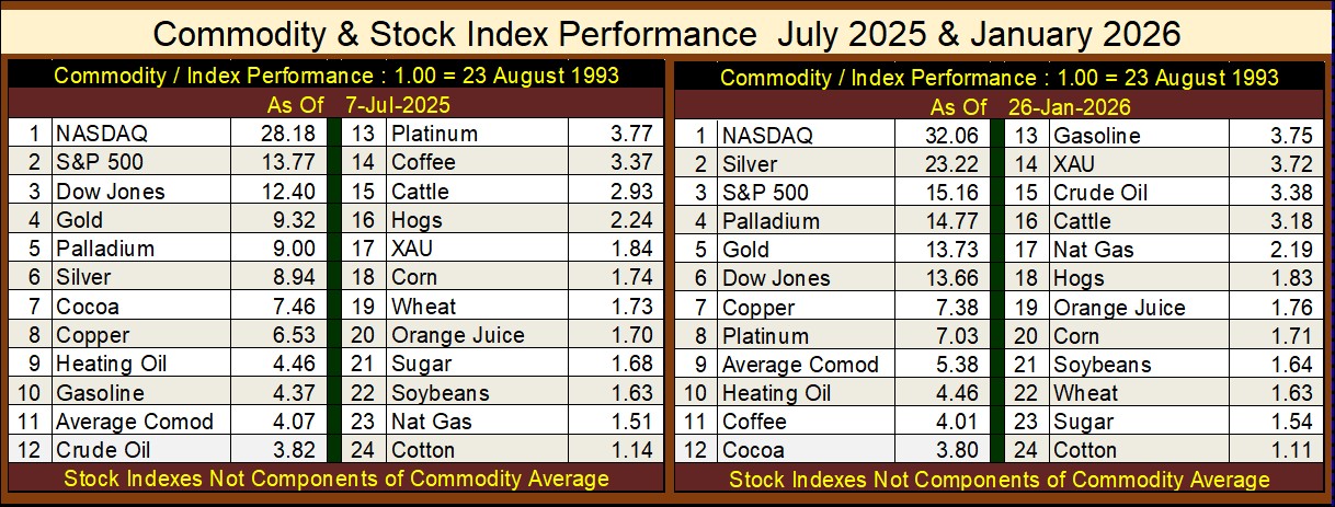 Below are two tables listing the relative performances for the commodities I follow on a weekly basis, along with the NASDAQ Composite, S&P-500, the Dow Jones and XAU.  I chose 23 August 1993 as the basis date for these tables, as that was when Alan Greenspan, began inflating the bubble in the NASDAQ High-Tech stocks.  That is as good a start date as any for these tables.