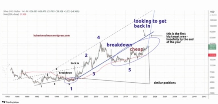 Precious metals analyst Hubert Moolman posted a Silver/ US Dollar chart dating from 1983. He says that based on the fractal in the chart (a fractal is a pattern of five consecutive price bars that signals a potential trend reversal or continuation), “it is expected that we are now likely in a sustained silver rally similar to 2010-2011, for example.” Silver hit a then-high of $49.51 in April 2011, broken on Tuesday by a fresh record-high $53.