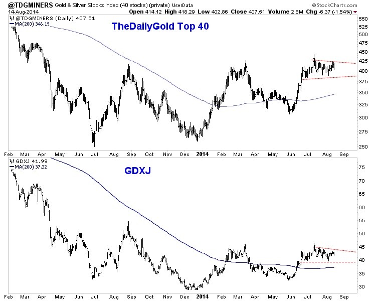 There is also an obvious change of character in the trading of the miners. First, compare the recent peak to the previous peaks (March 2014 and August 2013). At both peaks GDXJ shed 20% within 10 trading days. GDXJ and the top 40 have consolidated for over one month yet haven’t declined more than 10%. In addition, the 200-day moving averages, which were sloping down and resistance in 2013 are now sloping up slightly and figure to provide support if need be.
