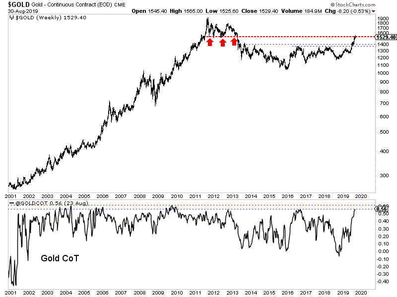 The combination of multi-year resistance at $1550/oz and the current high net speculative position could force gold down to a retest of $1400/oz.