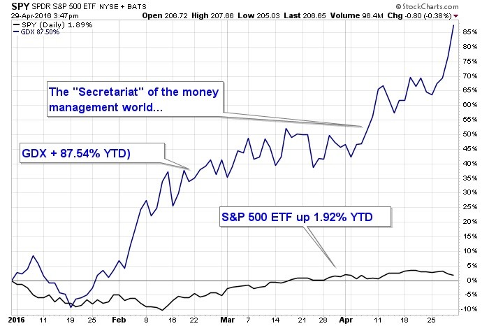 One look at the chart below and you are immediately struck by the "shock and awe" campaign of "no corrections," where the market doesn't allow traders to buy back their favorite mining positions at prices representing only the meagerest of percentage pullbacks. In fact, after nearly 40 years of trading the miners, I have never ever seen a market with such awesome power behind it that is truly such a wonder to behold. The HUI has exploded out of the post-FOMC gate like Secretariat at the Belmont Stakes in 1973. (If you ever want to see an incredible feat by a horse, watch the Youtube clip of the race that clinched the first Triple Crown in 25 years AND was won by an incredible 25 lengths.) Just as that horse left the pack at the halfway point of the race, precious metals are massively outperforming the S&P by a vast margin, and are forcing the money managers to be dragged into the market, teeth clenched and fingers clawing the ground.