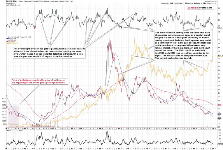 In 10 out of 12 previous cases when palladium rallied on a weekly basis and it happened on big volume, the implications were bearish for gold in the short run (not necessarily in the immediate term).