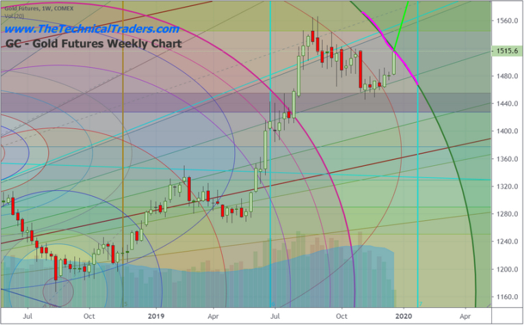This GDXJ Weekly chart provides a less volatile option for skilled traders to trade this upside price move in Metals and miners. It is very clear to see the upside resistance on this chart near $43.10 and the fact that the current upside price rally bar is targeting that level. Once this level is broken, we believe upside target levels near $46.50, 51.24, and $60.80 are likely. Each of these upside price targets represents a moderately strong upside potential in gold and is contingent on a strong rally taking place breaking the initial Green Fibonacci Price Amplitude Arc as we suggested near the top of this article.