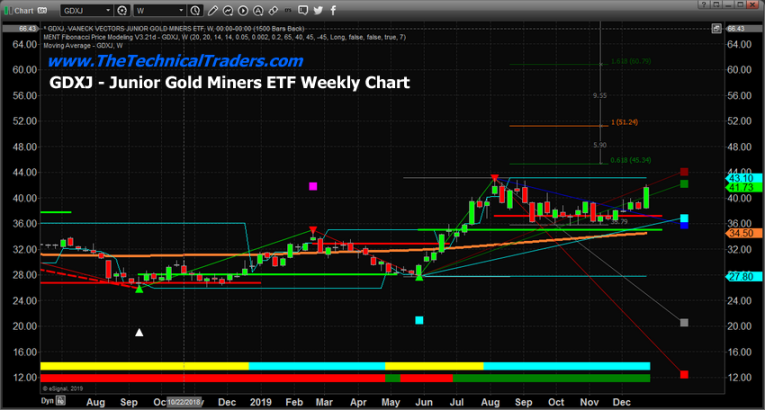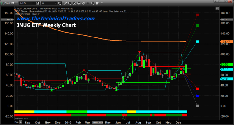 This JNUG Weekly chart highlights our Adaptive Fibonacci Price Modeling system and clearly shows the upside potential/targets base on Weekly price rotation. The bottom setup near $52.40 in early November sets up a price range from the peak in early August to the bottom in early November. This range suggests an upside price rally may take place in JNUG that targets $124.50, $155.65, and $176.00. These levels are based on the adaptive Fibonacci price theory applied to the expanding price rotations over the past 2+ years.